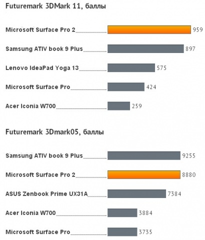 По результатам тестов Futuremark 3DMark 11, Futuremark 3Dmark06 и Futuremark PCMark 07 планшет обходит по производительности как своего предшественника (Microsoft Surface Pro), так и всех своих конкурентов (Lenovo IdeaPad Yoga 13, Samsung ATIV book 9 Plus, ASUS Zenbook Prime UX31A и Acer Iconia W700). А вот в тестах Futuremark 3Dmark05 и Futuremark PCMark05 американский трансформер демонстрирует более низкий результат, чем Samsung ATIV book 9 Plus.