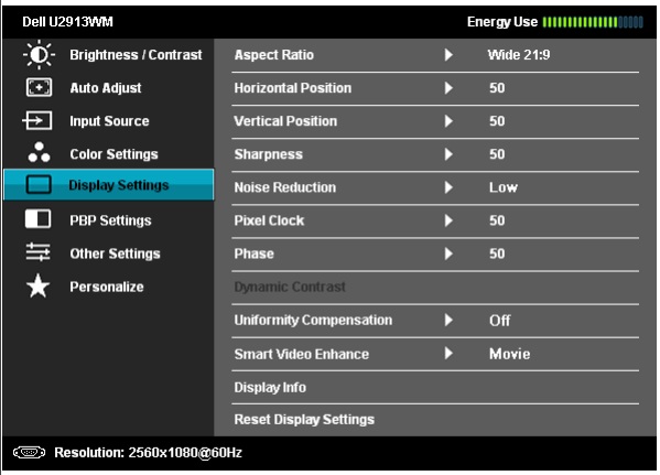 В основе монитора Dell U2913wm лежит 29-дюймовая матрица с разрешением 2560х1080 пикселей, произведённая компанией LG. Сделана матрица по технологии AH-IPS, имеет подсветку W-LED и привычное матовое покрытие, которое предотвращает появление на поверхности экрана бликов. Как следствие картинка на мониторе Dell U2913wm, как и на всех мониторах с матовым покрытием дисплея, имеет незначительный «кристаллический» эффект. Из-за того, что разрешение составляет 2560х1080 пикселей, владельцу монитора придётся использовать именно шнур DVI-D, идущий в комплекте и «вытягивающий» столь большое разрешение, на не обычный кабель DVI, которым комплектуются мониторы с меньшей диагональю.