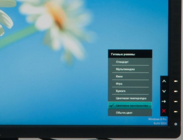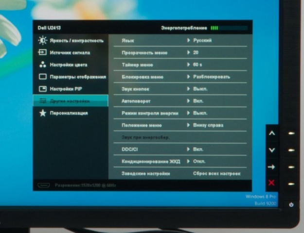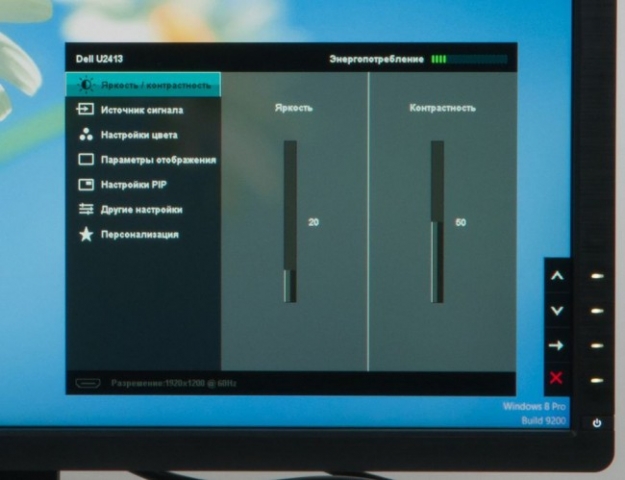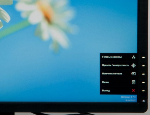 Кнопка включения монитора Dell UltraSharp U2413 механическая, она расположена в нижнем правом углу фронтальной панели. На кнопке включения есть характерный символ, информирующий о её предназначении, оборудованный белой светодиодной подсветкой. Когда монитор активен, подсветка кнопки питания горит постоянно, а когда он находится в режиме ожидания, она мигает также белым сетом, каждые 3-4 секунды. Сенсорные кнопки управления расположены над кнопкой питания, они также оснащены белой светодиодной подсветкой. При поднесении руки к нижней кнопке управления она загорается, после нажатия на неё вызывается «Меню» и становятся активными (загорается подсветка) остальные кнопки управления. Стоит отметить неплохую отзывчивость кнопок управления. Случаи, когда кнопки не срабатывают при нажатии на них, очень редкие.