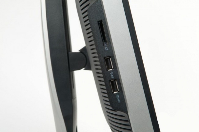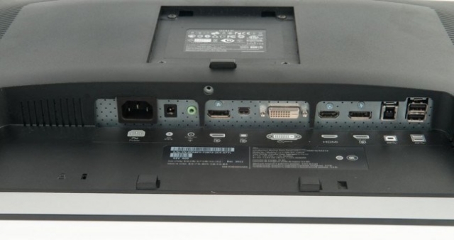 Также при желании монитор Dell UltraSharp U2413 можно повесить на стену, на специальное VESA-крепление размером 100 x 100 мм. Крепёжные отверстия находятся под пластиной, которой ножка подставки прикрепляется к корпусу монитора. Все порты и разъёмы направлены вниз, а поэтому после прикрепления монитора Dell U2413 на стену никаких проблем с подключением возникнуть не должно. На интерфейсной панели находятся видеовыходы HDMI, DVI, miniDisplayPort, DisplayPort и DisplayPort Out, используемые для подключения нескольких мониторов «цепочкой». Также на интерфейсной панели есть аудиовыход (звук выводится от HDMI или DP), пара разъёмов USB 3.0 и USB-хаб.