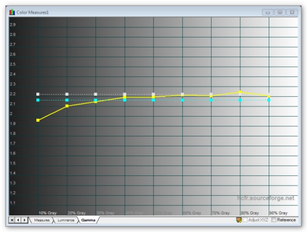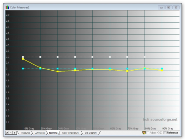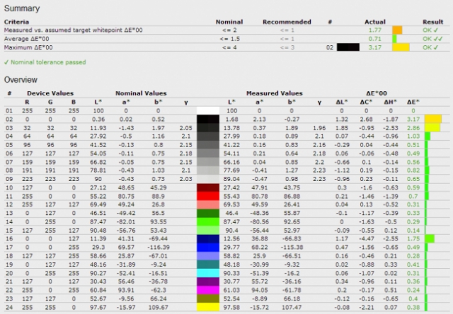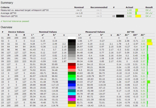 Пользовательская калибровка ожидаемо исправляет цветовую гамму и цветовую температуру, делая их графики практически линейными в области стандартных значений. Более точной цветопередачи добиться, к сожалению, намного сложнее, но и стандартные показатели не являются критичными.