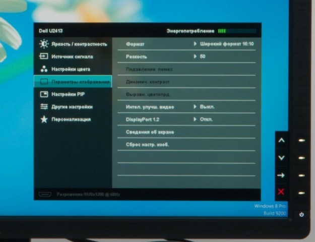 В основе 24-дюймового монитора Dell UltraSharp U2413 лежит матрица AH-IPS с разрешением 1920х1200 пикселей, произведённая компанией LG. В перечне производителя данная модель называется Display LM240WU9-SLA1. «Родное» соотношение сторон панели составляет 16:10, но его можно регулировать в зависимости от разных нужд. Размер одного пикселя матрицы монитора Dell U2413 составляет 0,269 миллиметра. Минимальное время отклика матрицы 6 миллисекунд, при этом никаких настроек овердрайва в меню монитора нет. Глубина цвета составляет 8 бит + FRC («псевдо-10-битная»). Подсветка у монитора GB-LED. К примеру, подобная подсветка используется в мониторах ASUS PA249Q и LG 27EA83.