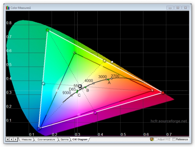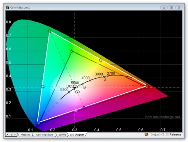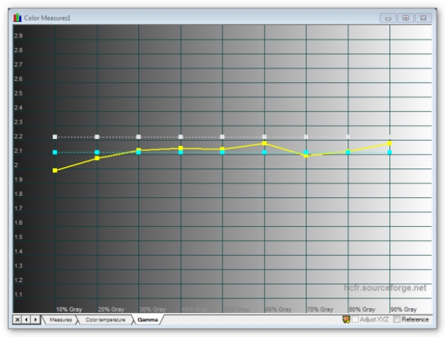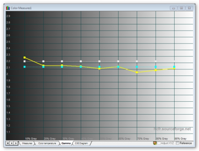 Цветовая температура, цветовой охват кривая гаммы (по шкале яркости) в режиме Adobe RGB: