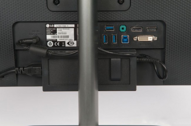 На интерфейсной панели монитора LG 27EA83 расположены видеовыходы HDMI, DisplayPort и Dual-Link DVI, а также хаб USB 3.0 с тремя разъёмами USB и аудиопортом, используемым для подключения наушников.