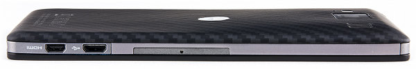 Рассмотрим функциональные элементы корпуса. На верхнем торце находится разъем для наушников. Кнопка-качель регулировки громкости и кнопка питания помещены на правой боковой стороне, а разъемы microUSB и microHDMI – на левой стороне. Посредством microHDMI-порта аппарат можно напрямую подключить к телевизору, жаль, только соответствующего кабеля в комплекте поставки нет.
