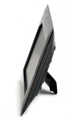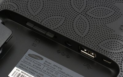 Кнопки управления производитель расположил сзади, очевидно для того чтобы не испортить внешний вид гладкой передней панели. Так же сзади находятся и интерфейсные разъёмы: mini- USB для связи с компьютером, разъём питания, слот для подключения SD карт, разъём USB 2.0. А в специальное углубление спрятана вращающаяся подставка.