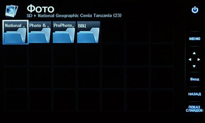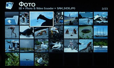 Просмотр фото можно осуществлять: из интегрированной памяти объёмом в 1 Гб, карт памяти формата SD/ SDHC или USB-флэш памяти. В главном меню возможно выбрать источник воспроизведения фото.