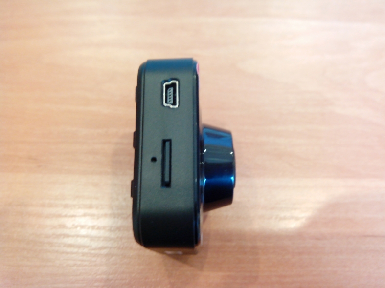 На боковой грани расположен mini-USB разъем. Именно с его помощью аппарат обменивается данными с другими устройствами, питание также поступает через него. Ниже расположен слот для карты памяти. Примечательно, что данное устройство уже комплектуется картой памяти десятого класса скорости. Для современных регистраторов именно такой класс скорости является оптимальным, так как поток видео хорошего качества успевает записываться на карту памяти без рывков и разрывов. Объем карты памяти из комплекта — 8 Гб. Максимальный объем карт памяти, который поддерживает Palmann DVR-15 M — 32 Гб.