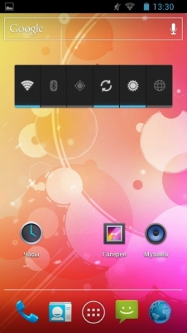 Из строки состояния выдвигается простенькая панель уведомлений. На ней можно ознакомиться с обновлениями приложений, закачанными файлами, новыми сообщениями, пропущенными звонками и тому подобное. Переключателей настроек на этой панели нет. Для того чтобы получить быстрый доступ к изменению звукового профиля, включению/выключению автоповорота экрана и активации/деактивации беспроводных модулей, нужно вынести на один из рабочих столов специальный виджет.