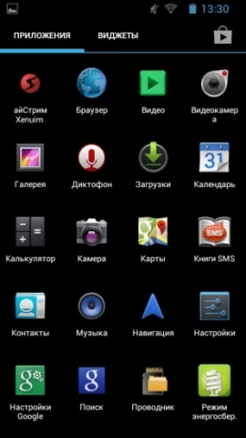 В главном меню в форме таблицы 4х5 располагаются иконки программ и игр. В верхней части меню располагаются две вкладки («Виджеты» и «Приложения») и иконка входа в магазин Google Play.