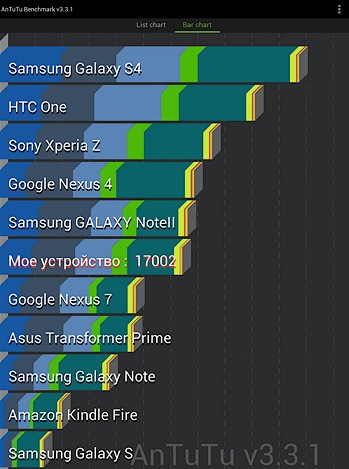 В синтетическом тесте производительности AnTuTu Benchmark аппарат демонстрирует высокий результат, набирая 17002 балла. Аналогичный результат демонстрирует популярный смартфон Samsung Galaxy Note II.