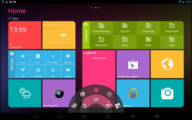 Интерфейс фирменной оболочки PiPO напоминает «Metro», который можно увидеть на устройствах под управлением операционной системы Windows 8. Экран планшета заполнен разноцветными плитками, представляющими собой ярлыки приложений. Если программа имеет виджет, то именно он и будет отображаться на плитке, если же нет, то на плитке будет отображаться просто значок приложения. В отличие от «Metro», в данной оболочке плитки не являются «живыми», то есть они не отображают обновления приложений. Пользователь может самостоятельно настраивать рабочие столы.