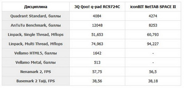 Уровень производительности 3Q RC9724C был оценен при помощи ряда синтетических тестов. Для сравнения результатов аналогичным испытаниям был подвергнут планшет Iconbit NetTAB SPACE II. Большинство технических характеристик (размер экрана и разрешение, количество оперативной памяти, процессор) обоих устройств совпадают. Результаты тестов сведены в таблицу, с которой вы можете ознакомиться ниже.