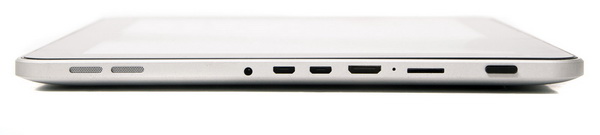 Большинство разъемов находится на правом торце планшета. Здесь нашлось место для слота карточек microSD, портов miniHDMI, microUSB, microUSB OT, разъемов для подключения питания и зарядного устройства. Рядом находятся кнопка «назад», а также акустические отверстия микрофона и стереофонических динамиков.