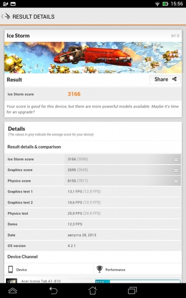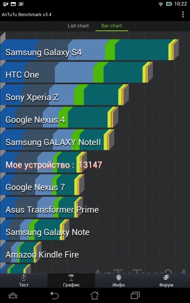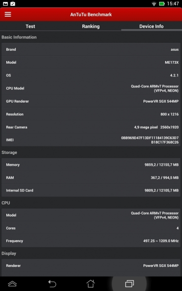 В синтетическом тесте производительности AnTuTu Benchmark модель MeMO Pad HD 7 набрала 13147 баллов, что является весьма неплохим результатом, как для планшета средней ценовой категории. Производительность «таблетки» Asus MeMO Pad HD 7 выше даже, чем у модели Google Nexus 7 2012 года впуска, построенной на базе процессора на Nvidia Tegra 3.