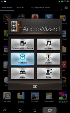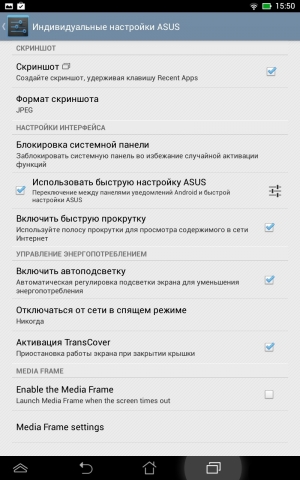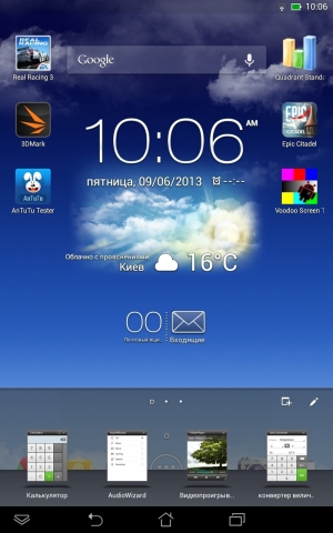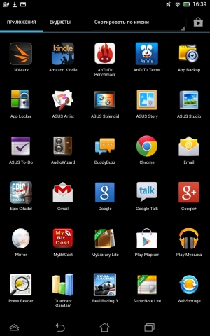 Помимо стандартного пакета приложений от компании Google, на планшет установлен пакет фирменных программ от компании Asus. Среди предустановленных программ хотелось бы отметить функциональную галерею Asus Studio, позволяющую синхронизировать снимки с социальными сетями, утилиту для настройки цветовой гаммы экрана Asus Splendid, программу Asus Artist позволяющую самостоятельно создавать открытки и рисунки, а также блокнот с функцией создания заметок Asus To-Do.