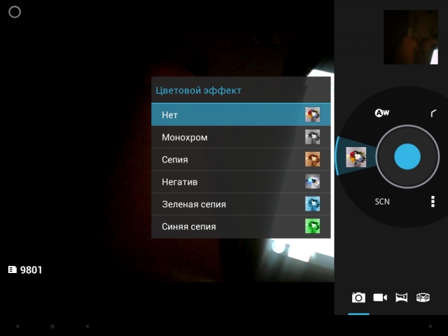 Камера обладает всеми стандартными для Android-устройств настройками. Пользователь планшета может выбрать режим съёмки, настроить экспозицию, активировать геотеги, выбрать длительность видеосъёмки, режим аудио, включить функцию подавления мерцания и тому подобное. Имеется также набор цветовых эффектов: сепия, монохром, синяя сепия, негатив и зелёная сепия.