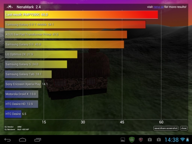 В синтетическом тесте NenaMark2 планшет демонстрирует результат 60 кадров в секунду, что является хорошим показателем. В бенчмарке AnTuTu аппарат набирает 10939 баллов, незначительно отставая в рейтинге от результатов Google Nexus 7 и Asus Transformer Prime.