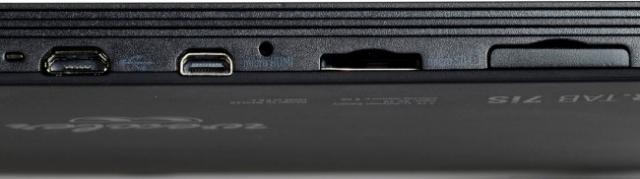 Боковые грани планшета Wexler Tab 7iS, как упоминалось ранее, имеют достаточно сложную форму - длинные боковины плоские, а короткие боковины наклонены в сторону фронтальной панели. К тому же часть боковин смежная с фронтальной панелью является окантовкой дисплея, дополнительно защищающей его от царапин, когда планшет лежит дисплеем вниз. По периметру всех четырёх боковых граней планшетного компьютера проходит двойная канавка.