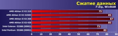 Процессор тестировался в двух режимах работы: в первом случае он функционировал на штатной частоте, а во втором - был немного разогнан. В разгоне его частота соответствовала таковой у старшей модели в линейке Athlon II X2. Все процессоры этого семейства можно разгонять одним способом: увеличивая опорную тактовую частоту. Для сравнения были отобраны следующие процессоры: Athlon II X2 255, Athlon II X3 425, Pentium E5300 и Celeron E3300.