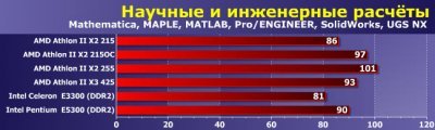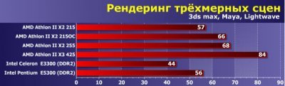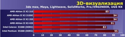 Общеизвестно, что программы для 3D-моделирования в последнее время отдают предпочтение процессорам Intel с их передовой архитектурой. Процессоры AMD способны противостоять им, только если они имеют заметное преимущество в виде более высоких частот работы ядер или более скоростные модули памяти. Но модели процессоров линейки Celeron значительно урезаны по своим характеристикам по сравнению с производительными процессорами Intel среднего ценового сегмента. Поэтому Athlon II X2 215 опережает своего более дорогого соперника Е3300. С помощью разгона ему даже удается достичь уровня производительности старшей модели линейки. Этому в значительной степени способствовала большая скорость работы оперативной памяти. Но показатели младшей модели Pentium ему превзойти не удалось.