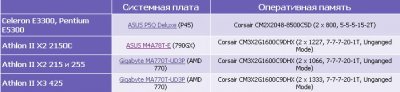 Первый из них имеет вдвое больший кэш L2 и характеризуется более высокой тактовой частотой, чем герой нашего обзора. У второго три ядра, третий тоже характеризуется большим в два раза кэшем L2, который является общим для двух ядер. А четвертый имеет практически такие же характеристики, но его штатная частота меньше на 200 МГц. В процессе испытаний использовались модули памяти DDR2 и DDR3, причем последней отдавалось предпочтение, но что касается процессоров производства Intel, то для них пришлось использовать память типа DDR2, так как они имеют относительную низкую частоту шины FSB, которая составляет 800 МГц. А процессоры Athlon II наоборот эффективно работают с памятью DDR3, что в настоящий момент является их важным преимуществом в их конкурентной борьбе.