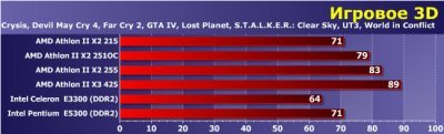 Быстродействие всех трех моделей процессоров от AMD находится на хорошем уровне, что примечательно, так это то, что в фаворитах оказывается недорогой трехядерный X3 425, который даже в самых тяжелых графических приложениях продемонстрировал достойную производительность. В настоящее время, для того чтобы комфортно играть в ресурсоемкие игры, необходимо иметь не только мощную видеокарту, но и производительный трех или четырехядерный процессор.