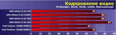 Видеокодеки потребляют много ресурсов и, что немаловажно, у них нет каких либо предпочтений определенной процессорной архитектуре. В результате скорость работы X2 215 аналогична таковой у процессора Pentium. Но становится совершенно очевидным тот факт, что пользователям, которые планируют серьезно заниматься видео следует обратить свое внимание на модели процессоров с большим количеством ядер, преимущество которых над двухядерными ЦП приложениях такого рода неоспоримо.