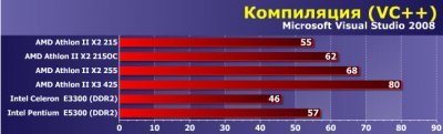 Программа Visual Studio отлично оптимизирована для всех современных способов повышения уровня производительности. Самое приоритетное из них - это большее количество ядер центрального процессора, поэтому неудивительно, что Athlon II X3 425 в этой ситуации находится вне конкуренции. Наблюдается линейный рост, обусловленный большим количеством ядер и высокой пропускной способностью памяти. Больший объем кэша тоже положительно сказывается на результатах, поэтому даже разогнанный X2 215 значительно отстает от старшей модели линейки, несмотря на то, что он имеет точно такую же тактовую частоту. Но все же со своей главной задачей он справился, существенно превысив показатели Celeron E3300.