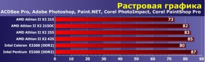 В таких приложениях некоторое преимущество за процессорами от Intel. Как известно эти программы более благосклонны к архитектуре Core 2, вследствие чего даже Celeron показывает пристойный результат. Вне конкуренции оказывается Pentium, от которого лишь немного отстает трехядерная модель от AMD, сказывается частичная оптимизация данных приложений под многопоточные вычисления. Совершенно очевидно, что X2 215 на штатных частотах не в состоянии соперничать с тремя другими процессорами.
