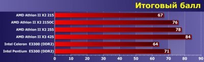 Необходимо отметить, что в целом процессор AMD Athlon II X2 215 продемонстрировал хорошие результаты быстродействия для продукта нижней ценовой категории. Практически во всех тестах он опередил конкурирующую модель Celeron, которая стоит несколько дороже. Это очень удачный вариант для сборки экономичной и тихой системы, предназначенной для учебы и поиска информации в сети Интернет.
