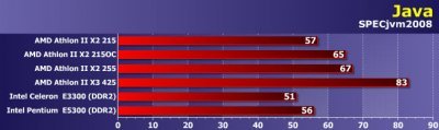 Виртуальная Java-машина нетребовательна к объему КЭШа, поэтому не удивительно, что герой нашего обзора работая на штатной частоте опережает Pentium E5300, а в разгоне всего на несколько процентов отстает от X2 255. Но в абсолютные лидеры выходит младшая трехядерная модель от AMD, которая демонстрирует высокую производительность.