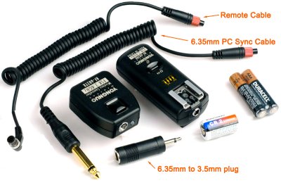Входят в комплект: приёмник, передатчик с антенной, кабеля: 3.5 мм, 6.35 мм, PC-синхрокабель, 2хAAA алкалиновые батарейки GP, а также руководство пользователя.
