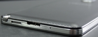 На верхнем торце девайса можно увидеть отверстие аудиовыхода, микрофон и инфракрасный порт. На нижнем торце находятся разъём microUSB, отверстие динамика, микрофон и разъём для стилуса. Динамик прикрыт декоративной решёткой. Он демонстрирует высокий уровень громкости, но его случайно можно перекрыть рукой. Стилус S-Pen надёжно зафиксирован в своём отсеке.