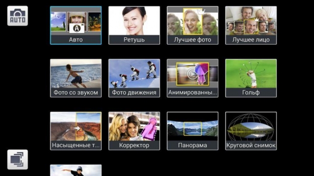 Камера имеет много различных режимов съёмки: авто, фото со звуком, фото движения, гольф, круговой снимок, панорама, лучшее фото, ретушь, лучшее лицо, анимированный снимок, насыщенные тона, корректор, HDR (High Dynamic Range) и спорт.