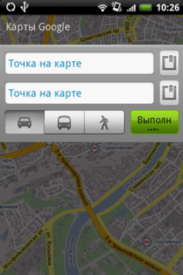 При этом пиктограмма в строке состояния мигает зеленым цветом. Географические координаты с помощью навигатора определяются достаточно быстро, для этого обычно достаточно нескольких минут. С целью экономии заряда батареи можно определять свою дислокацию, используя только систему A-GPS. Для точного расчета маршрута следования очень удобно пользоваться приложением «Карты», разработанное компанией Google в котором есть несколько режимов навигации: пешеходный, автомобильный, а также оригинальный режим, который учитывает графики движения общественного транспорта в крупных мегаполисах.