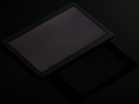 Видно, что цвета у обоих планшетов не «поплыли», но у Samsung черный цвет засвечен значительно больше. И вправду, черное поле при отклонении по диагонали становится светлее, но с красно-фиолетовым оттенком или же остается нейтрально-серым. Для сопоставления, картинка с Google Nexus 7 это отображает (при этом яркость у данных планшетов равная):