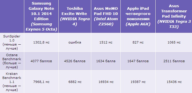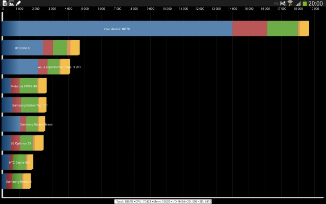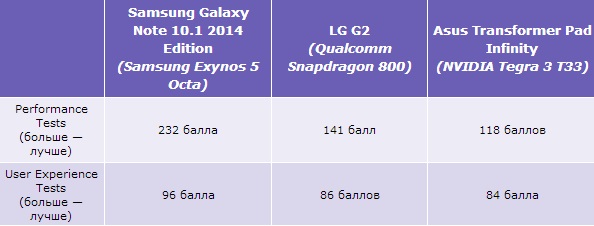 Исходя из данных результатов, видим, что Samsung Galaxy Note 10.1 серьезно обошел LG G2, на базе SoC Qualcomm Snapdragon 800.