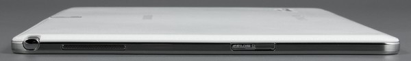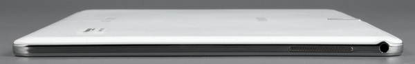 На левой грани планшета находятся один динамик и разъем MiniJack 3,5 миллиметров для наушников, а на правой грани — разъем, в котором находится стилус S Pen, второй динамик и слот для карты памяти microSD, закрывающийся специальной крышкой.