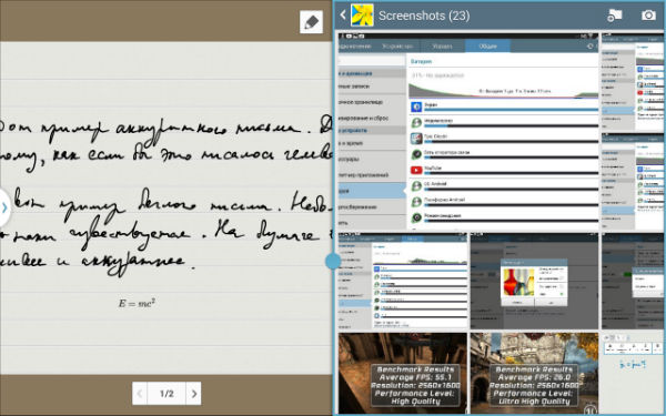 Двухоконный режим был и в предыдущем Galaxy Note 10.1, опять же, в новой версии планшета реализация сильно различается. На скриншоте вы видите открытые в таком режиме S Note (слева) и Галерею (справа). Сейчас же, то есть в новой версии, это делается иначе. Необходимо зажать кнопку "назад", и слева на экране появится стрелочка, нажав на которую, мы увидим панель с приложениями, которые поддерживают двухоконный режим.