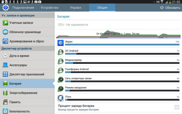Обратим внимание еще на одну особенность планшета. Это размежевание раздела Настройки на несколько закладок.