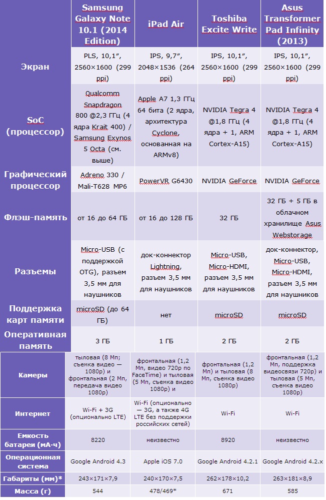Глядя на характеристики можно сказать, что большинство данных аппарата идентичны планшетофону Galaxy Note 3 (кроме параметров экрана и его габаритов). В целом - это бесспорно топовый и очень высокий уровень, который практически по всем характеристикам соответствует лучшим планшетным новинкам 2013 года. Сравнивая его с передовыми новинками Asus и Toshiba, то рассматриваемый Samsung Galaxy Note 10.1 выглядит достойно, а по некоторым характеристиках и мощнее. Но, очевидно, что его главный оппонент - новый iPad Air, выпущенный компанией Apple. Для наглядности можно ознакомиться с характеристиками всех этих планшетов - конкурентов в таблице.