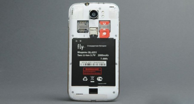Под тыльной крышкой находятся аккумуляторная батарея ёмкостью 2000 мАч, два слота для установки сим-карт и слот для установки карты памяти формата microSD.