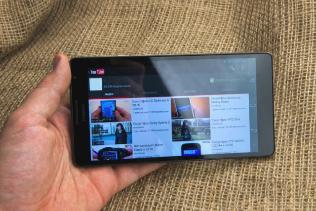 Модель Huawei Ascend Mate оснащена замечательным 6.1-дюймовым дисплеем с разрешением 1280х720 пикселей (HD). Плотность пикселей 241 штуки на дюйм. Если не подносить устройство к самому носу, то пиксельную зернистость увидеть попросту невозможно. Матрица дисплея сделана по технологии Super IPS+, а поэтому экран смартфона имеет качественную цветопередачу и широкие углы обзора. Минимальная яркость подсветки составляет 9 кд/м2 и позволяет с комфортом для глаз читать даже в кромешной темноте. Максимальная яркость подсветки дисплея 416 кд/м2, а поэтому дисплей почти не слепнет даже под прямыми солнечными лучами. Контрастность матрицы 684:1, что также не может не радовать. Дисплей Huawei Ascend Mate имеет очень чувствительный датчик, позволяющий зимой пользоваться смартфоном в перчатках.