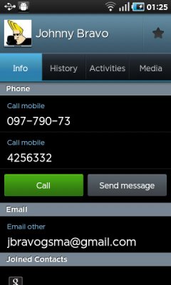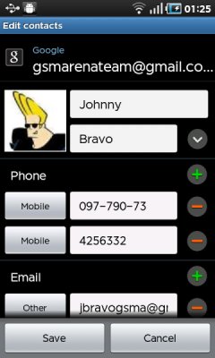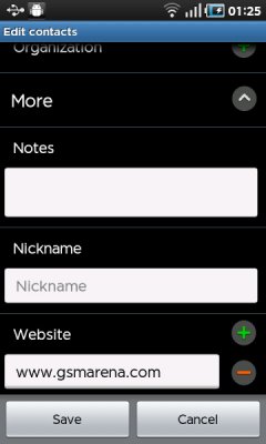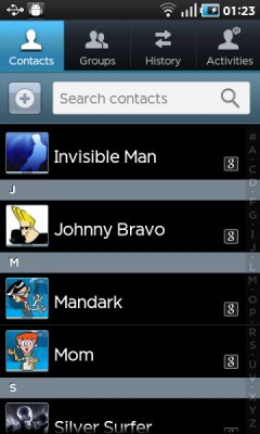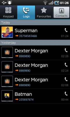 Дизайн Armani нашел применение в телефонной книге. Прежде всего, как в любом Android-смартфоне, в I9010 Galaxy S GA телефонная книга обладает широкими возможностями. GA style отразился в шрифте и в отображении контакта, которому пользователем не назначена картинка. В этом случае отображается фигура человека на фоне эмблемы GA.