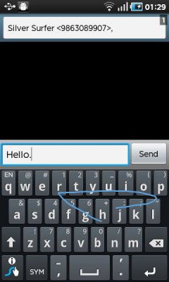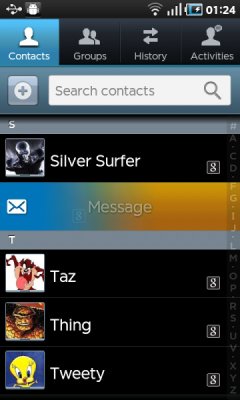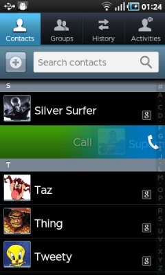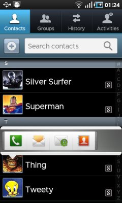 Находясь в списке контактов, пользователь, проведя пальцем по экрану вправо, наберет номер телефона по умолчанию, который назначен для контакта. Если провести пальцем в левую сторону, то откроется поле для написания нового текстового сообщения. Поддержка скольжения вправо-влево является частью оболочки TouchWiz, которая работает и в других меню, где есть имена и номера телефонов (например, в меню сообщений).