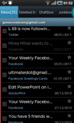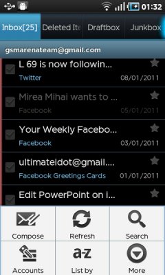В Samsung I9010 Galaxy S Giorgio Armani есть обычное приложение, отвечающее за электронную почту. Это приложение поддерживает POP и IMAP. Оно работает с созданными онлайн папками входящих, исходящих сообщений и черновиков. Если у пользователя много имейл-аккаунтов, то он может объединить всю входящую корреспонденцию в одной папке Входящие, что весьма удобно.