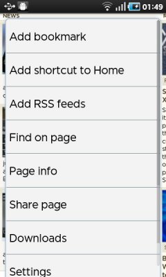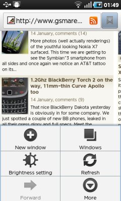 При щелчке по кнопке Меню всплывает окно с шестью пунктами: открыть новую вкладку, перейти на следующую вкладку, обновить страницу, вперед и открыть закладки. Шестая кнопка отвечает за расширенное меню (копирование текста, найти на странице и т.д.)