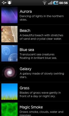 Главное меню реализовано по аналогии с рабочими столами. В верхней части экрана отображается номер страницы меню. При желании, можно установить отображение в виде списка. Структуру меню тоже возможно изменять путем добавления и удаления приложений.
