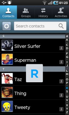 Для поиска нужного контакта из списка можно листать список, а можно быстро перемещаться по списку благодаря алфавиту, расположенному вдоль правого края экрана.